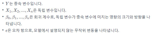 회귀분석에서 가장 기본적인 형태는 선형 회귀분석입니다. 선형 회귀의 일반적인 수식은 다음과 같습니다: