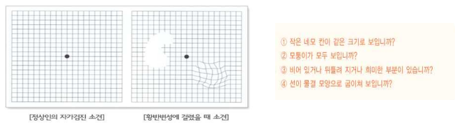 - 안저 검사: 망막의 상태를 직접 살펴봄으로써 황반의 변화를 확인.