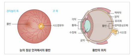 - 황반변성은 눈의 망막 중심부인 황반에 영향을 미치는 질병으로, 주로 고령자에서 발생한다. 이 질환은 시력 중심부를 담당하는 황반의 기능이 떨어지면서 시력 감소를 일으키며, 크게 건성과 습성 두 가지 유형으로 나뉜다. 건성 황반변성은 망막에 노폐물이 쌓여 서서히 진행되는 반면, 습성 황반변성은 비정상적인 혈관이 자라나 출혈과 누수를 일으켜 시력 손실이 빠르게 진행될 수 있다 .