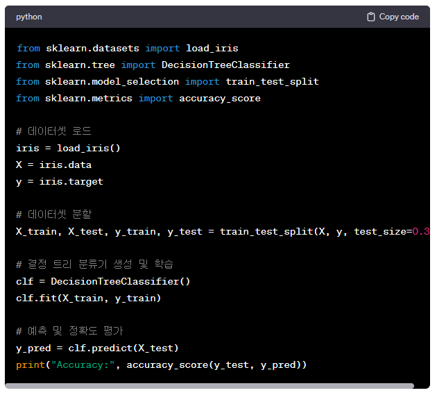 이 코드는 아이리스 데이터셋을 사용하여 결정 트리 모델을 학습하고, 테스트 데이터에 대한 정확도를 계산합니다.