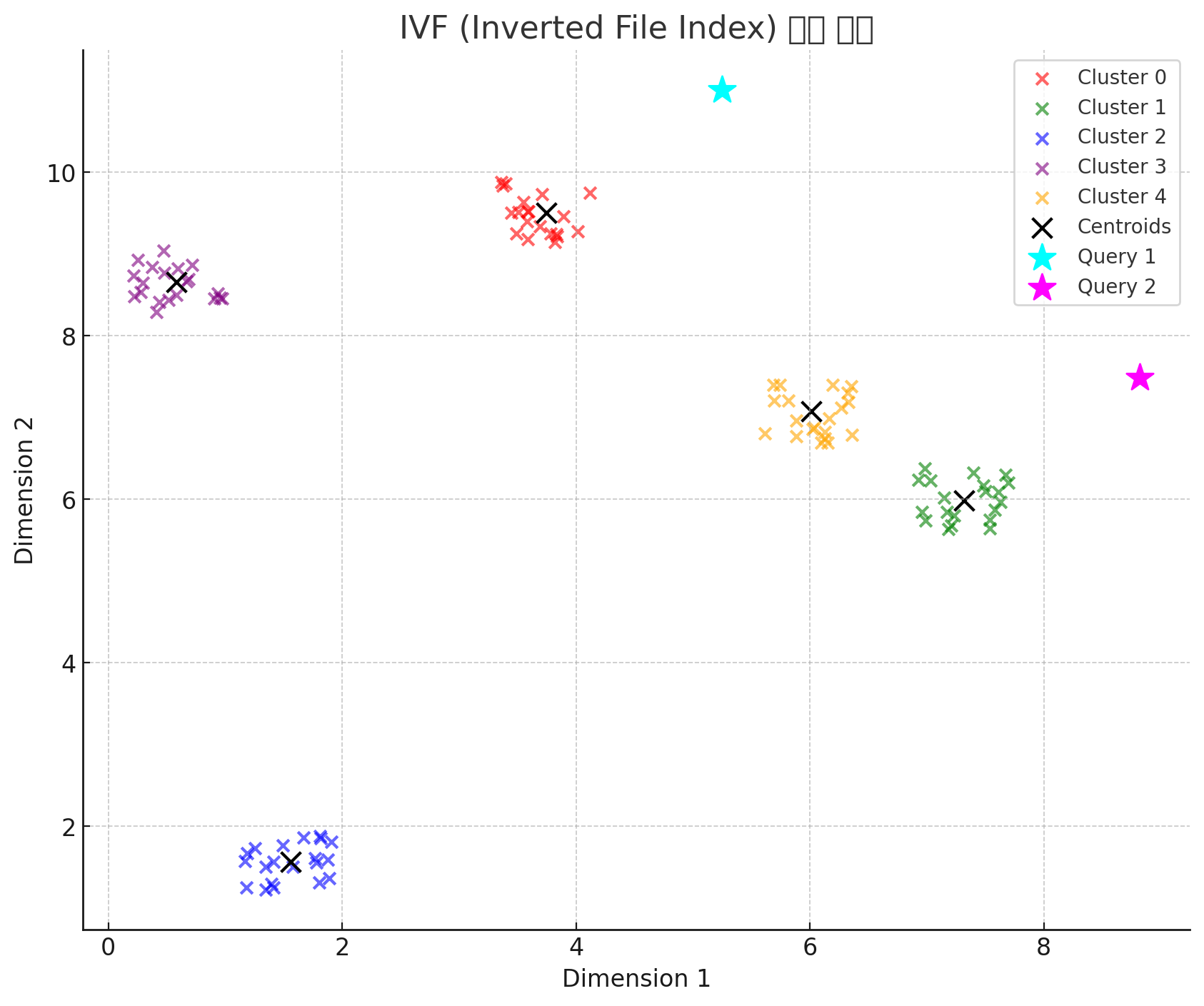 | ❌ 단점 | 정확도가 약간 떨어질 수 있음 (근사 검색), 클러스터 수 및 nprobe 설정이 성능에 큰 영향 |