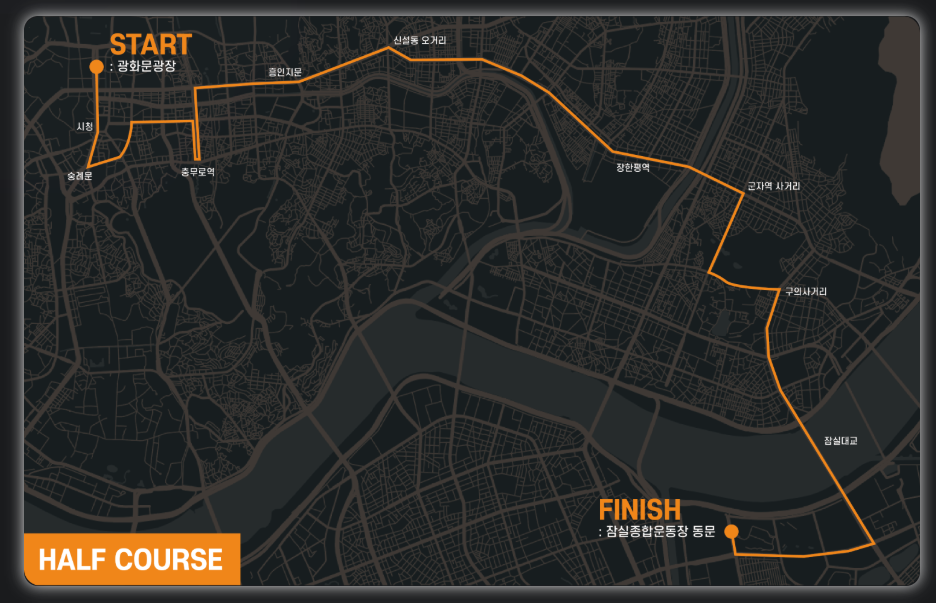 코스를 보시면 Half 기준으로 광화문 광장에서 출발해 장한평, 군자를 거쳐 잠실 종합 운동장 까지 서울을 전부 거쳐가는 러닝에 볼것들이 많은 코스 일것 같네요~ !!