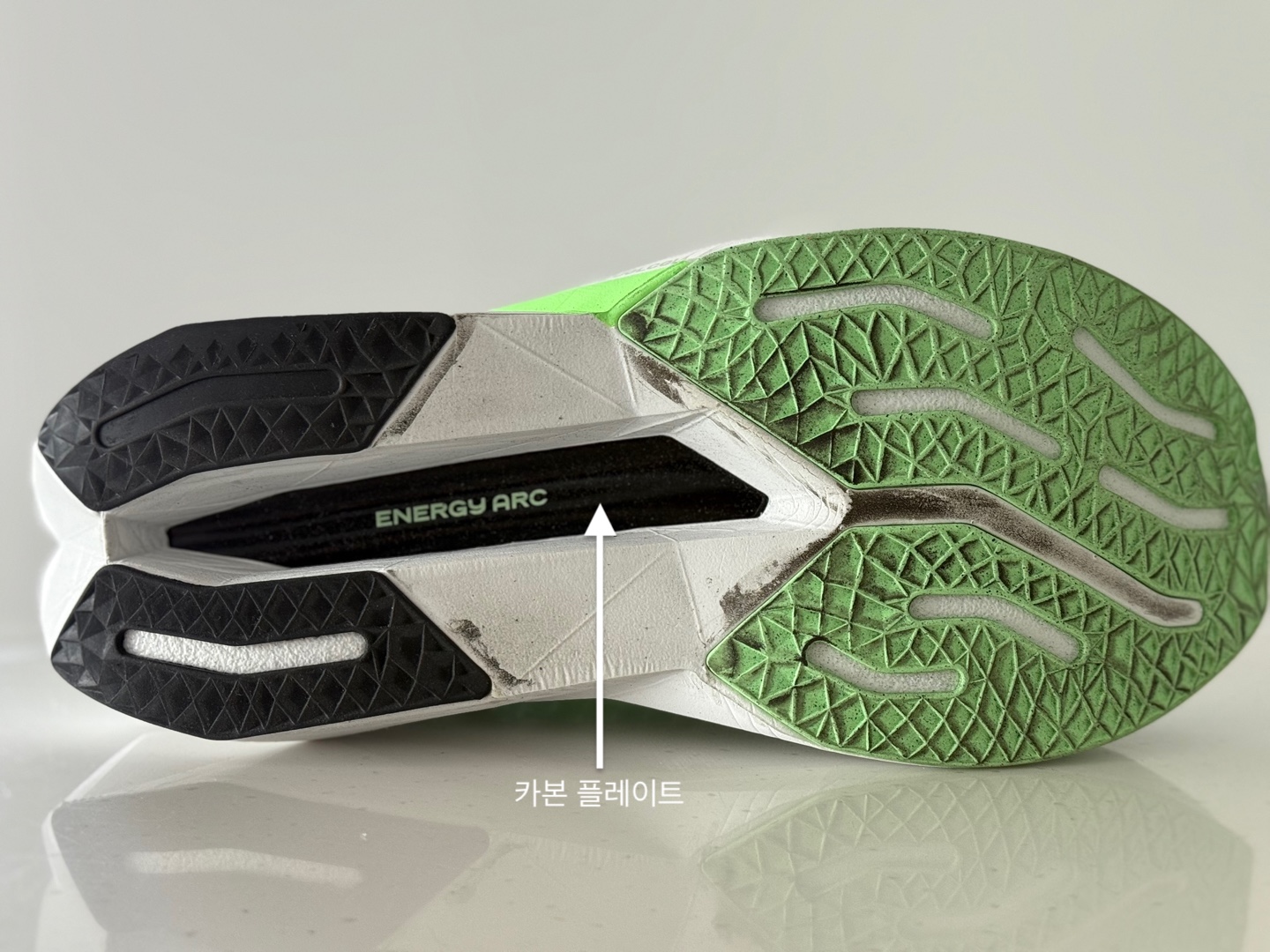 카본 플레이트는 미드솔 속에 얇고 단단한 탄소섬유판을 넣어, 발의 에너지를 앞으로 밀어주는 장치입니다.